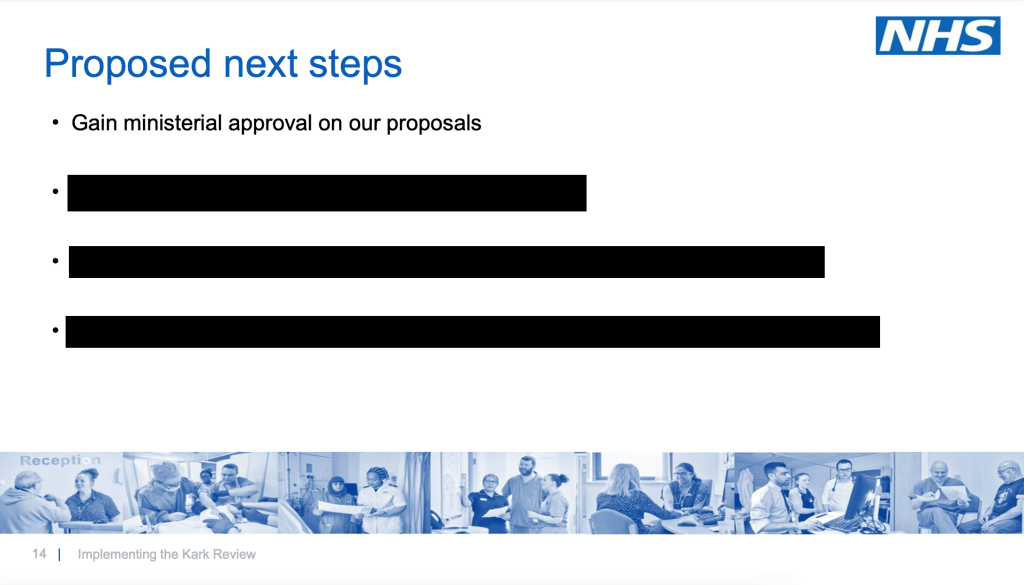 I pressed NHS Improvement to be transparent about progress on the Kark implementation, and received a farcically opaque response after much chasing and a complaint about NHSI’s Chief People Officer’s repeated failure to respond to enquiries. The documents obtained from NHSI were redacted to the point of absurdity: