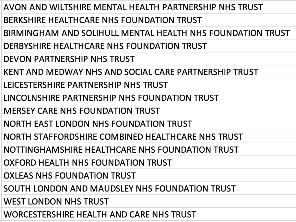 In addition to trusts which provide mental health services, I also looked at a selection of other types of trusts.
