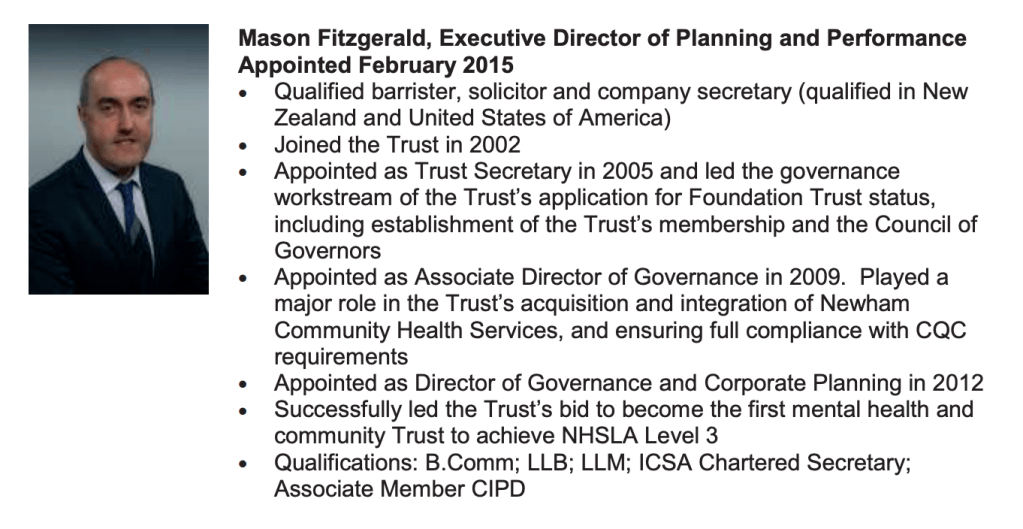 This is Mason Fitzgerald’s biog, as reported in East London NHS Foundation Trust’s annual report 2018-19: