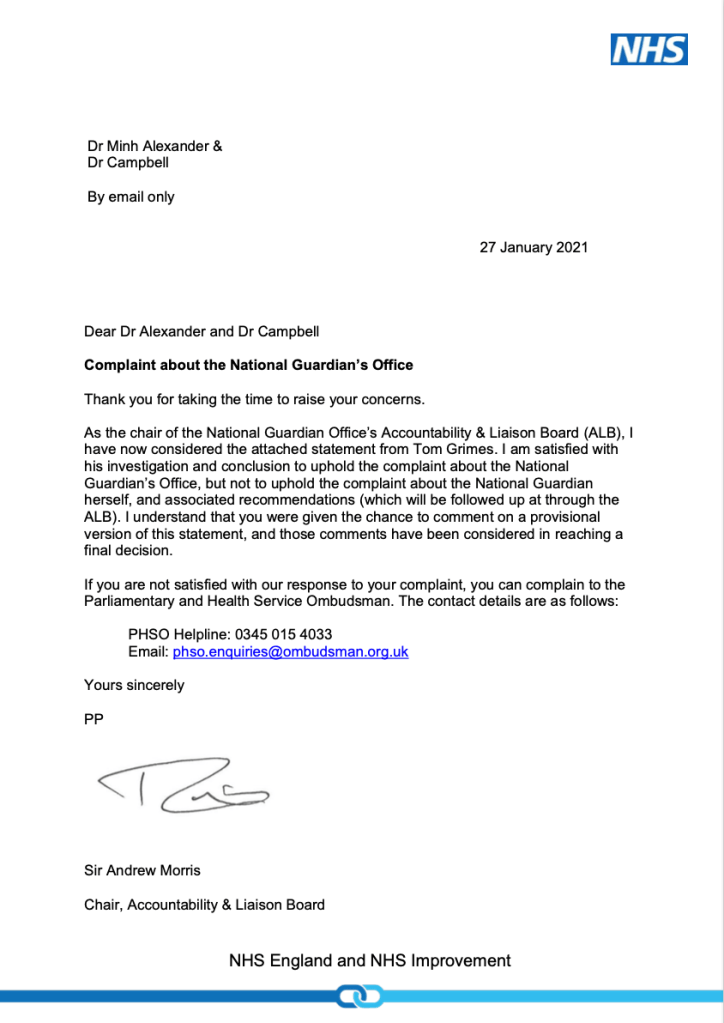 The final NHS Improvement complaint investigation report of 27 January 2021 into the apparent breach of Dr Campbell’s confidentiality was signed off and accepted in full by Andrew Morris, NHS Improvement Non Executive director and chair of the National Guardian’s Accountability and Liaison Board.