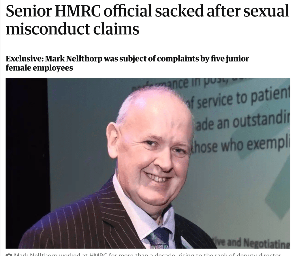 | Mark Nellthorp the former chair of Portsmouth Hospitals University NHS Trust up until 2017 was also a senior civil servant at HMRC. He was sacked by HMRC in September 2018 after multiple sexual harassment allegations “The Guardian understands that concerns about Nellthorp’s behaviour were known to HMRC for some time.” Employment Tribunal claims arose from the allegations against Mr Nellthorp: Mrs E King v HM Revenue and Customs and Mr M Nellthorp: 3331671/2018 Ms J Short v HM Revenue and Customs and Mark Nellthorp: 2404602/2019 |