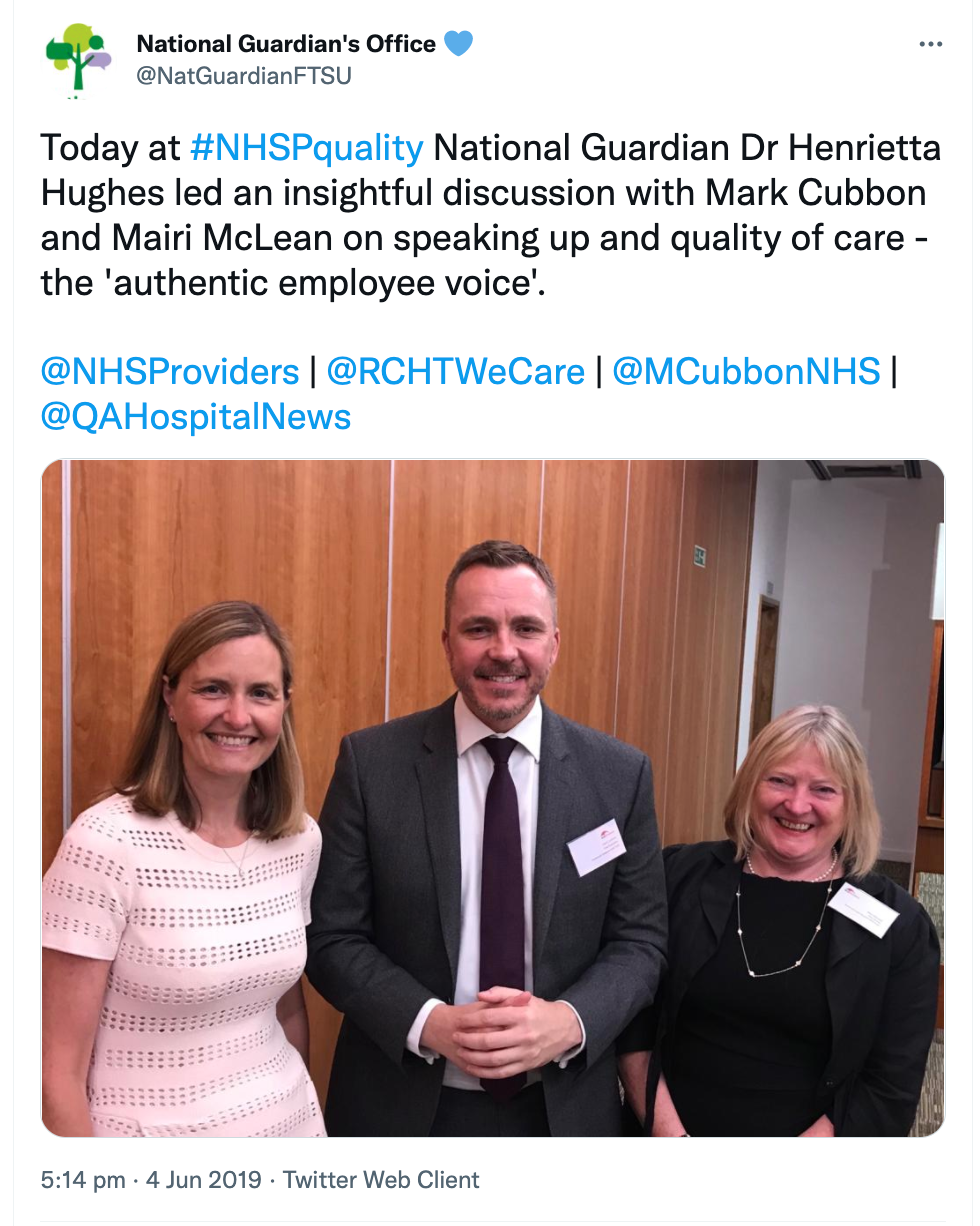 Mark Cubbon is pictured below in 2019 with the previous National Freedom To Speak Guardian on the theme of the “authentic employee voice”. This was whilst Dr Macanovic’s Employment Tribunal claim was proceeding: