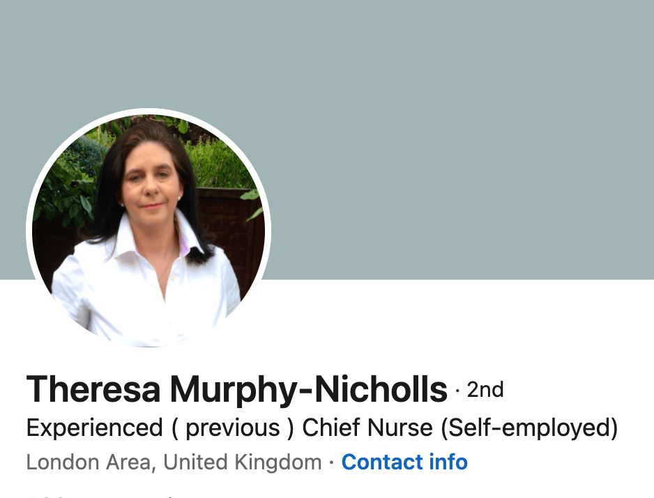 | Therese Murphy now describes herself as a former chief nurse on her LinkedIn entry. Like the disgraced Paula Vasco-Knight who called herself “Doctor”, Murphy previously styled herself as “Professor” which according to a local press report was based on an honorary award from the City of London University: “She was awarded the Florence Nightingale leadership scholarship in 2012 and is an honorary professor for the City of London University” |