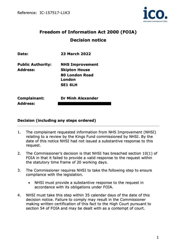 I asked NHSE/I, under FOIA, about the context in which the King’s Fund review was commissioned and for a copy of the report itself.