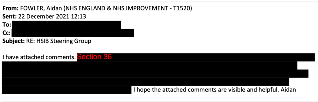 A draft version of the King’s Fund report was shared with NHSE/I. An email and attached comments by Aidan Fowler on this draft report were redacted and omitted from the disclosure bundle by NHSE/I under FOIA Section 36 exemption. That is on grounds that it might prejudice the effective conduct of public affairs. Or in plain English, embarrass important people.