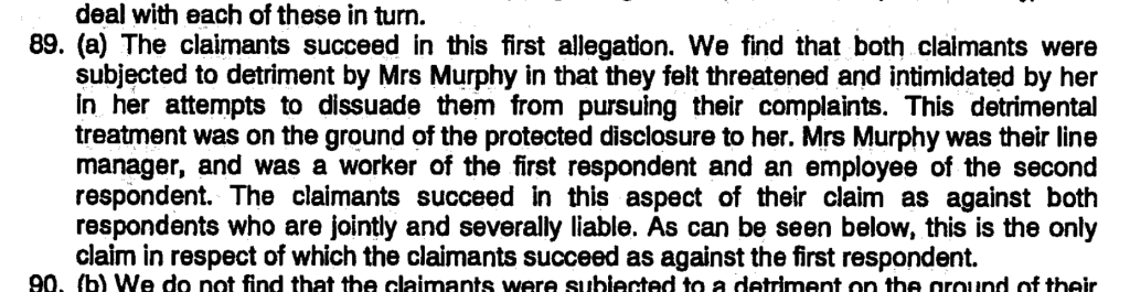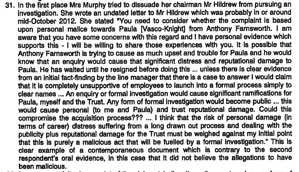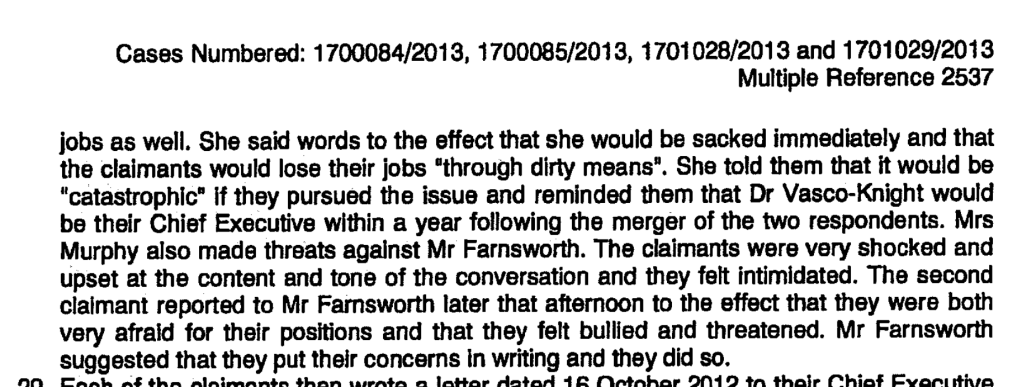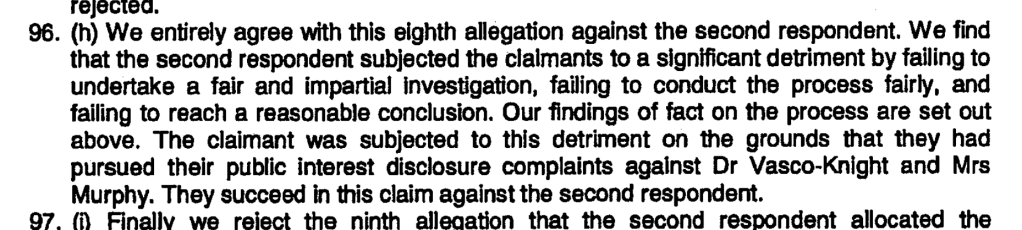 The trust Human Resources Director Adrienne Murphy was also found guilty of whistleblower reprisal, for trying to dissuade Gates and Sardari from pursuing their concerns and making them feel intimidated. Not only did Murphy make the whistleblowers feel intimidated, but according to the ET, Murphy tried to convince the trust Chair not to investigate the whistleblowers’ concerns about her behaviour and that of Paula Vasco-Knight. The ET also determined that the trust’s procedural response to the whistleblowers had been unfair. The HR director’s role in this must be in question.