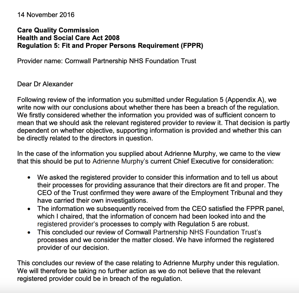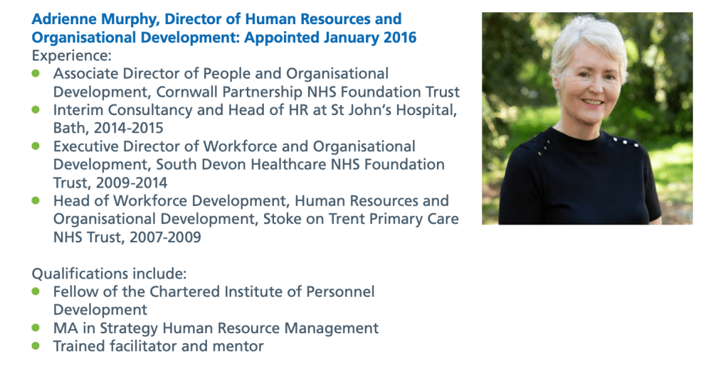Parallel to the FPPR process on Vasco-Knight, another FPPR referral was made to the CQC on Adrienne Murphy. She had been given a job as HR director by the mental health trust Cornwall Partnership NHS Foundation Trust, despite (or perhaps it was even because of?) the history of ET proven whistleblower reprisal.