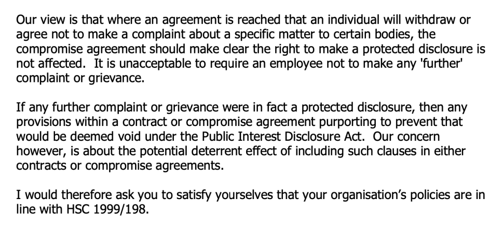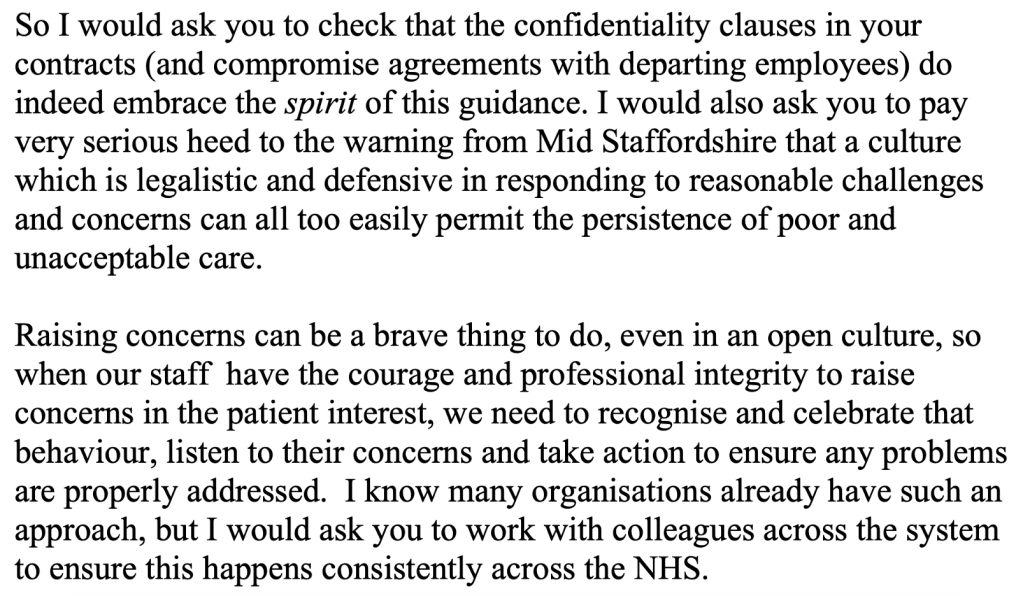 This was not in fact even new policy. David Nicholson had already written to NHS trusts in January 2012 to the same effect, requiring them to make it clear in settlement agreements that whistleblowing could not be restricted by any settlement: