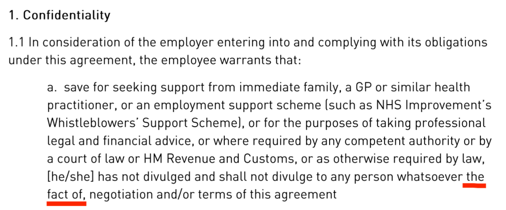 This is the critical clause in NHS Employers’ current template settlement agreement which prevents signatories from revealing the existence of settlements: