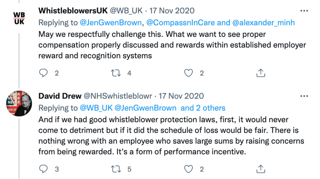That looks like “rewards” by any other name. Indeed, some members of the Whistleblowing APPG have spoken in favour of whistleblower rewards and incentives.