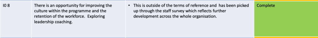 There is an opportunity for improving the culture within the programme and the retention of the workforce. Exploring leadership coaching.”