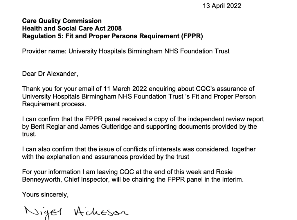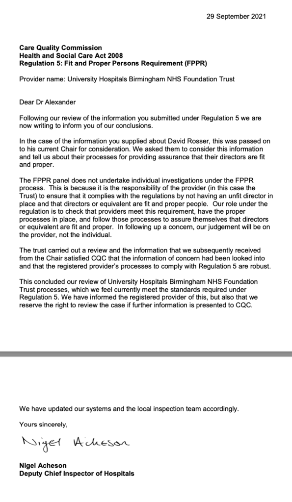 CQC did at least apologise for misleading me by initially claiming that the UHB FPPR investigation into Rosser was “independent”: