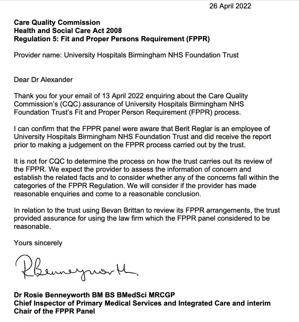 The CQC replied that it had satisfied itself that UHB’s process was sound and that its FPPR panel had received a copy of an “independent” FPPR report by two individuals, Berit Reglar and James Gutteridge.