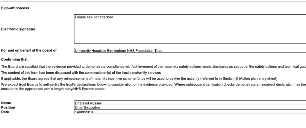 This is a screenshot from the FOI of the 2019 sign off in Dr Rosser’s name, taken from the trust’s declaration document for year two of NHS Resolution’s maternity incentive scheme: