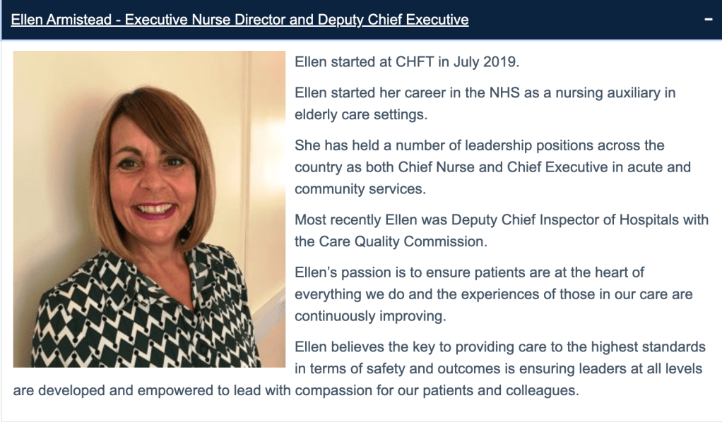 | An example of CQC’s troubling proximity to the providers that it is supposed to regulate, and the fast-spinning CQC revolving door Ellen Armistead was CQC Deputy Chief Inspector of Hospitals CQC disclosed that she chaired the CQC’s FPPR panel between February 2016 and June 2019 Armistead left CQC in June 2019, and became Chief Nurse and Deputy Chief Executive of Calderdale and Huddersfield NHS Foundation Trust in July 2019. |