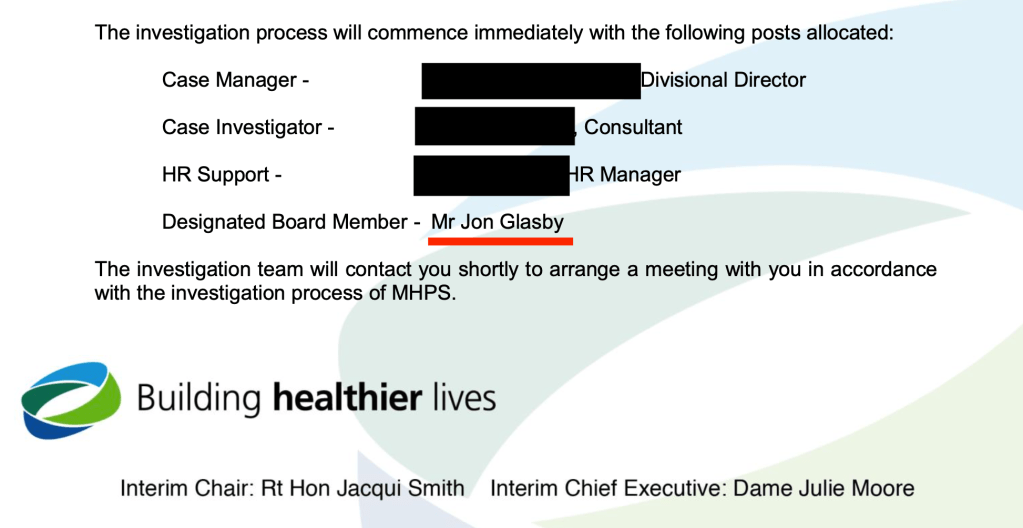This raised an additional issue of conflict of interest because Glasby had previously worked with David Rosser (then as Medical Director) to oversee the trust’s suspension of and disciplinary action against Tristan Reuser, in Glasby’s capacity as MHPS Designated Board Member: