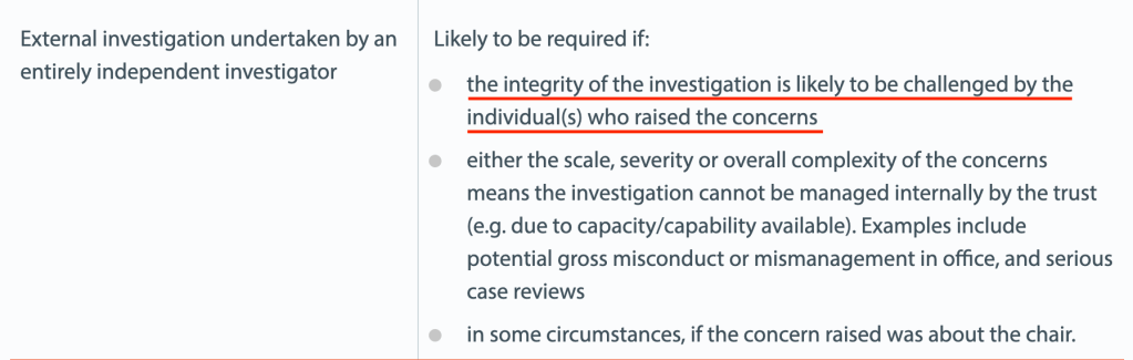 The trust maintained in its letter of 6 June 2022 that it adhered to NHS Providers’ guidance on FPPR. This is debatable given that NHS Providers’ criteria for triggering a fully external FPPR review is contentiousness. In the context of the Reuser litigation, that would seem to be fulfilled. Also, if the whistleblower at the centre of the matter did not have confidence in the process and had already withdrawn, the process had de facto been disputed.