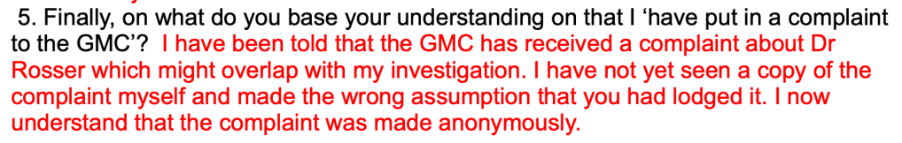 [NB It is relevant to note here that the GMC decided to only pass a single anonymous referral to its investigators, but withheld my earlier referral on identical grounds. One possible explanation is that this circumvented the requirement to provide feedback to a named referrer.]