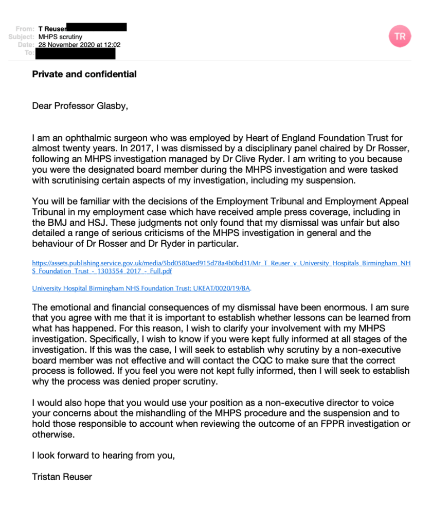 Separate to this, Mr Reuser wrote to Jon Glasby himself in November 2020, after the conclusion of his case in both the ET and the EAT. He asked if Jon Glasby had been kept properly informed of trust actions under MHPS, in the light of the ET and EAT’s serious criticisms of his suspension by the trust.