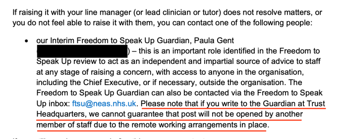 Shockingly, NEAS’ whistleblowing policy tells trust staff that there is no guarantee that their highly sensitive disclosure emails will only be opened by the Freedom To Speak Up Guardian. It does NOT say who else might open their emails: