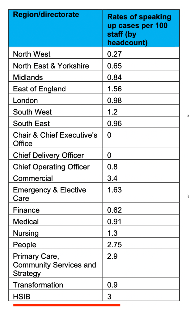The report shows that out of all NHS England’s departments, the Healthcare Safety Investigation Branch (HSIB) has the second highest rate of whistleblowing complaints, at 3 cases per 100 staff: