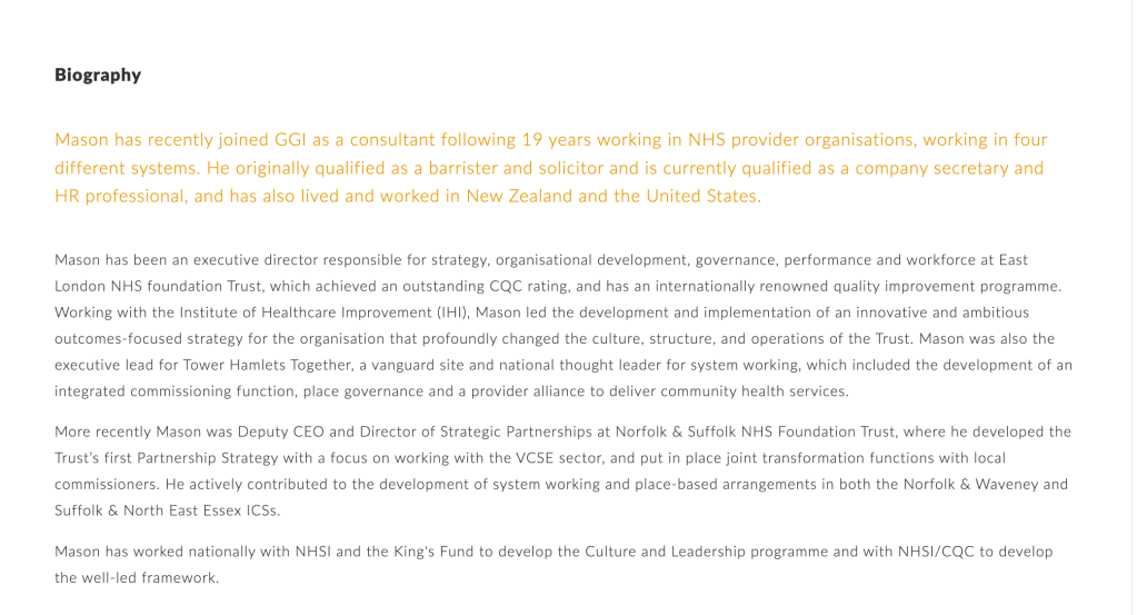 As you may recall, Mason Fitzgerald’s false CV claim was missed by ELFT and the CQC, but emerged after he was almost appointed as CEO of NSFT. Had that appointment process been completed, he would have had power over thousands of extremely vulnerable mental health patients: