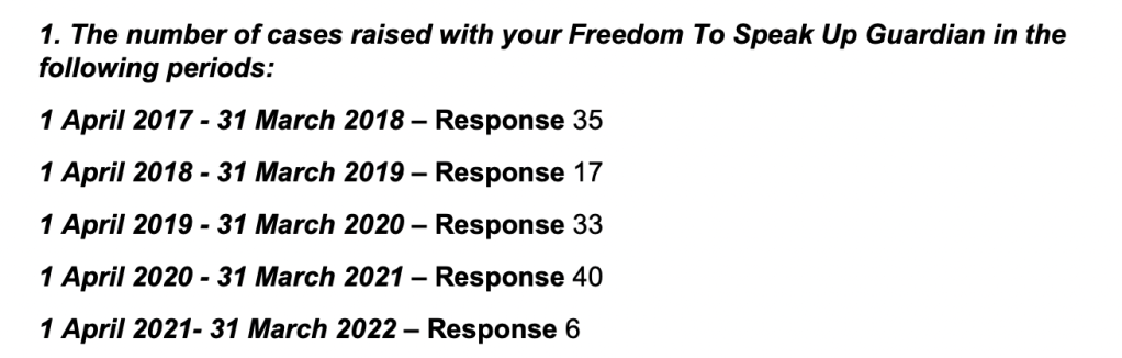 The response shows that in the course of five years, only 131 speaking up cases were raised with CQC’s own Freedom To Speak Up Guardian.