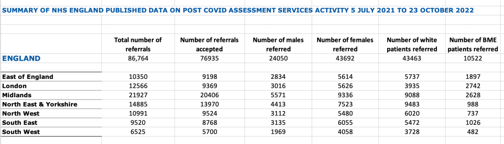 I have prepared a summary of the data that NHS England has so far shared with the public about post COVID assessment service activity, spanning the period 5 July 2021 to 23 October 2022: