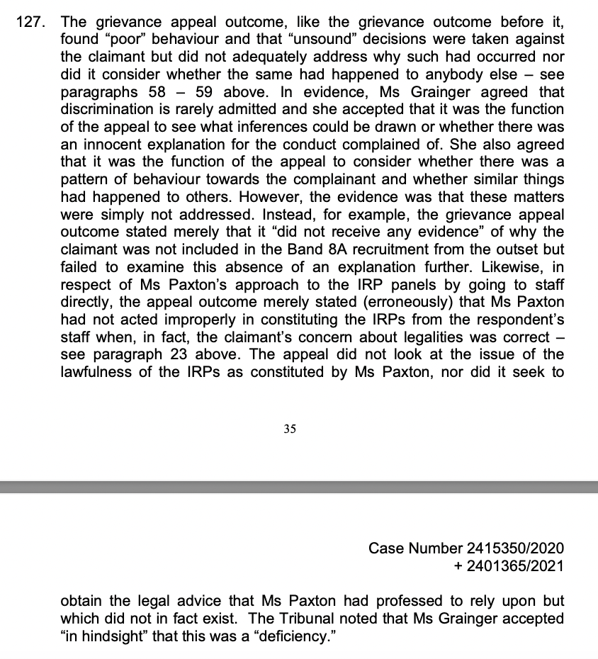 Very seriously, the Tribunal noted that Tracey Grainger failed to examine the “lawlessness of the IRP panels as constituted by Mrs Paxton”. This is another classic example of a whistleblower’s concerns being ignored: