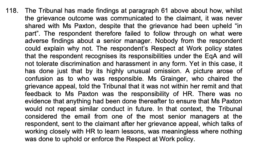 “When asked to explain this omission, Ms Grainger told the Tribunal that it was not within her remit and that feedback to Ms Paxton was the responsibility of HR. It was apparent from the evidence that such feedback had never taken place.”