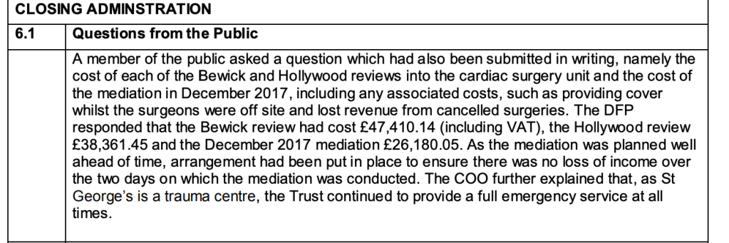 The Bewick review of cardiac surgery cost St Georges £47,410.14, as noted in trust board papers: