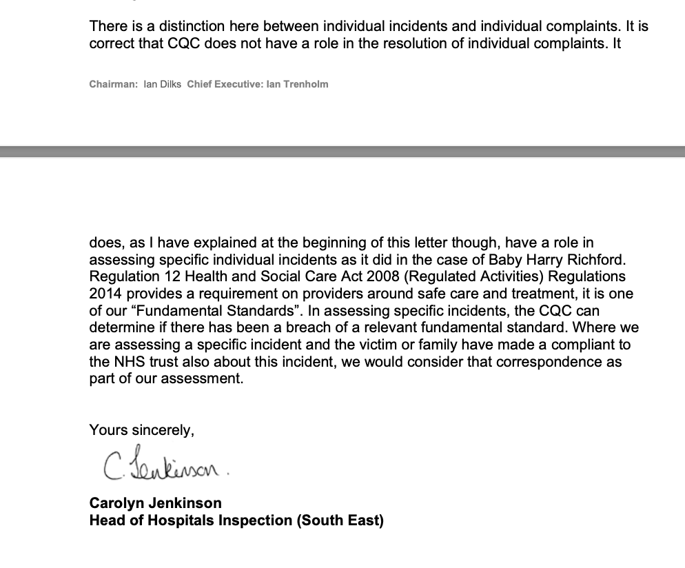 An example of CQC’s unreliability arose in the case of baby Harry Richford’s death at East Kent.