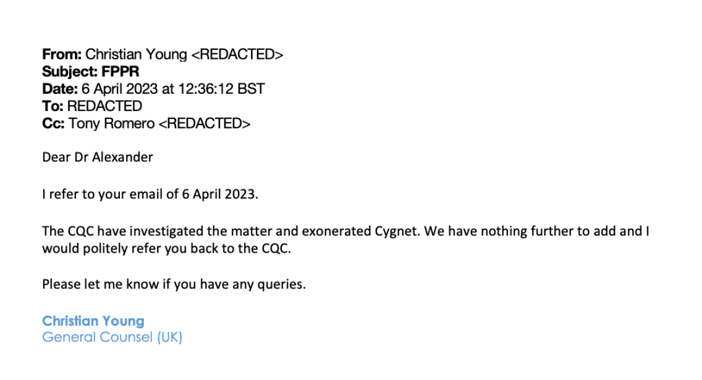 “This concludes CQC’s review of Cygnet Health Care under this regulation, as well as our correspondence with you on the application of Regulation 5 to all information you supplied.”