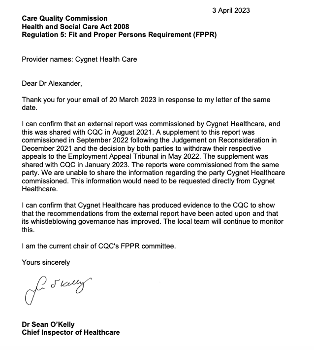 The Care Quality Commission has informed me that an Fit and Proper Person referral that I made on Cygnet directors under CQC Regulation 5 in 2021 has concluded, with the regulator concluding that whistleblowing processes at Cygnet have improved to the point where CQC considers that Cygnet is now meeting the requirements of Regulation 5.