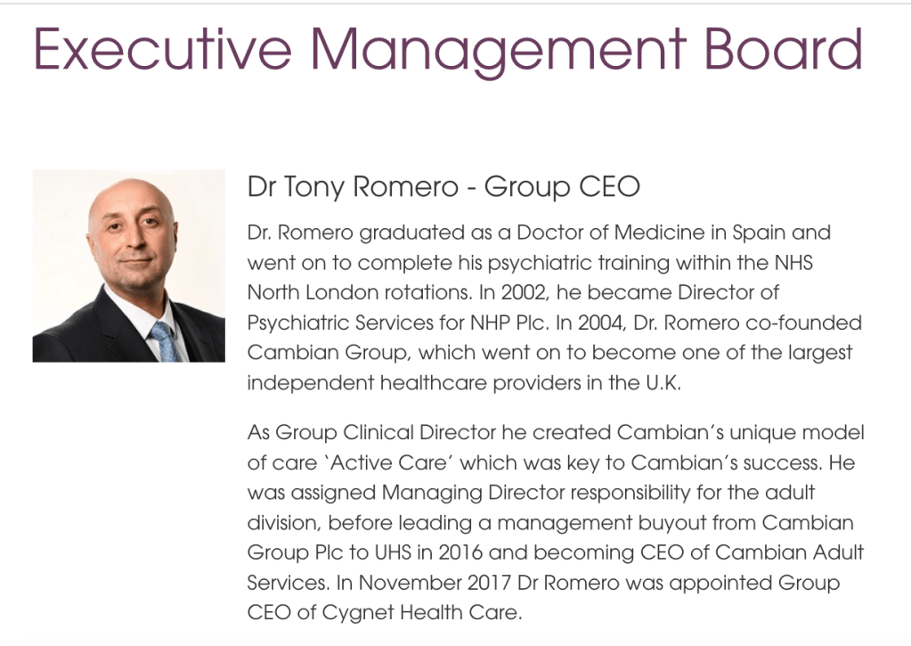 But for completeness, I will ask for a copy from Tony Romero Group CEO of Cygnet Health Care, whom the original ET criticised.