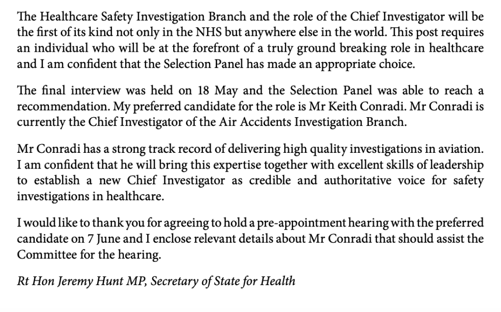 It may be relevant to revisit the letter of recommendation from Jeremy Hunt of 26 May 2016 to PACAC: