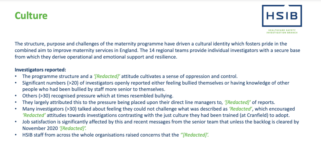 They found a number of disturbing shortcomings in the regionally based HSIB maternity programme, including issues of bullying.