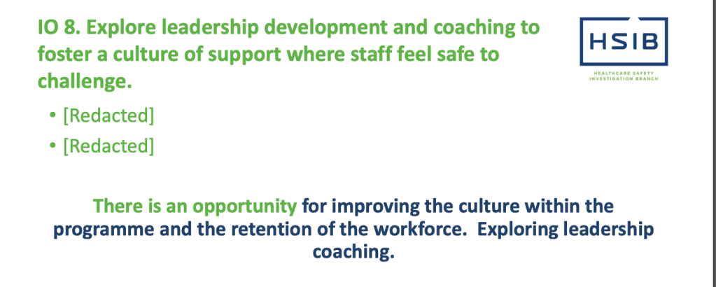 | 10.8 Explore leadership development and coaching to foster a culture of support where staff feel safe to challenge Staff talked about feeling ‘bullied’ or others being ‘bullied’ or targeted if they ‘put their head above the parapet and challenge the senior team’ Staff were not asked about being bullied, some staff volunteered this information The evaluation team recognise this has not been explored across the whole maternity structure Staff, who have left HSIB because they felt the investigation process compromised their integrity, reported fear of reprisal from the HSIB maternity programme senior management once they were working back in a clinical environment |