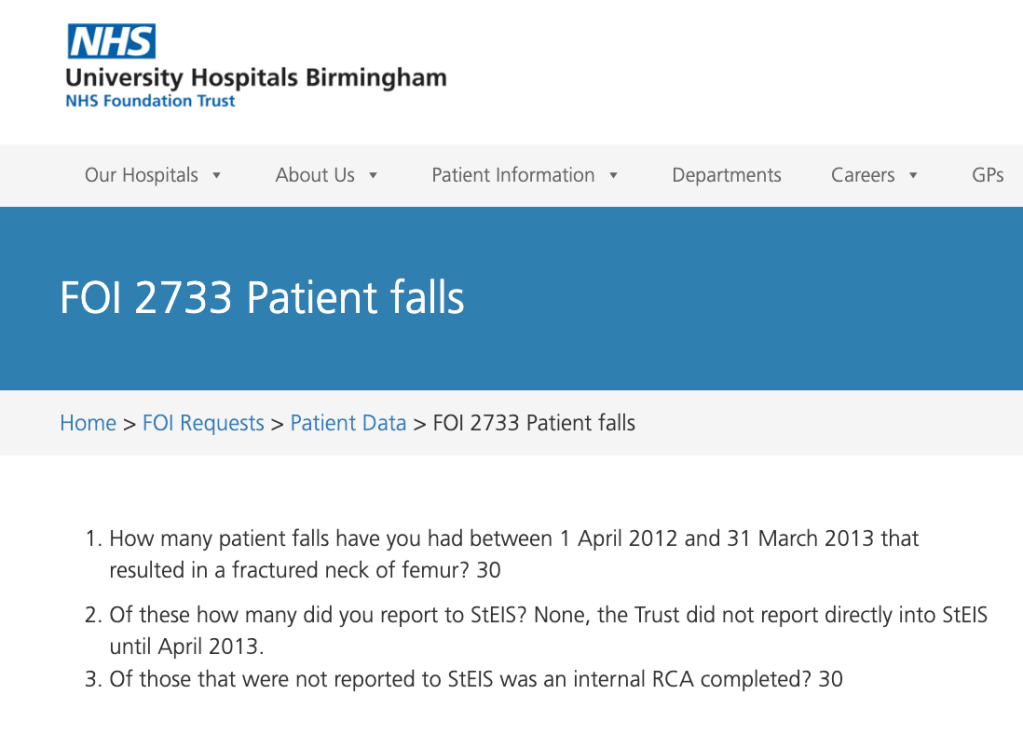 A previous UHB FOI disclosure revealed that there were 30 fractured necks of femur resulting from inpatient falls in the period 2012/13