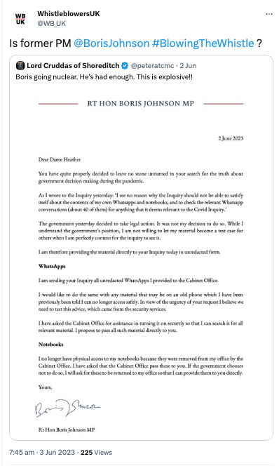 On 3 June 2023 WhistleblowersUK tweeted to suggest that Boris Johnson was a whistleblower in respect to his claimed plans to disclose pandemic related documents to the COVID inquiry.