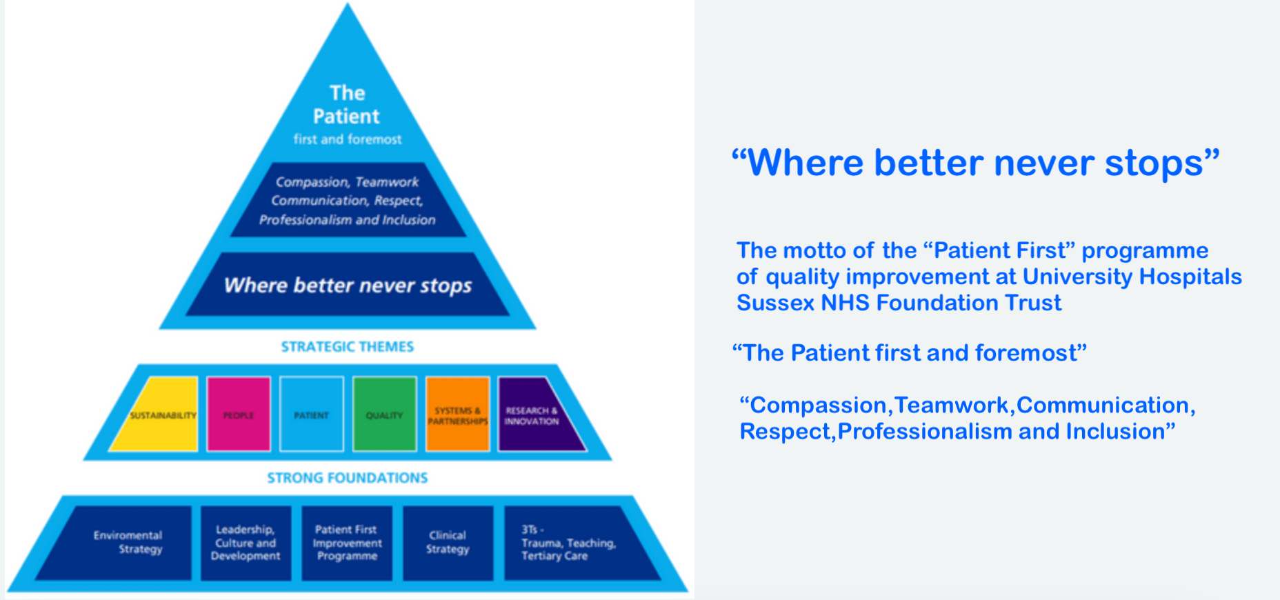 “Welcome to University Hospitals of Sussex. My name is Dr George Findlay. I am Chief Medical Officer and Deputy Chief Executive. We’re absolutely passionate about providing the highest quality care for patients every time and the best environment for our staff to work in. We’re really clear about the continued investment in services and we’ll continue to provide accident and emergency services, maternity services, trauma services and special services in all the locations we currently do. We’re absolutely passionate about research and innovation and working with our partner universities. We’ll make sure that we adopt best practice, our best roles and make the best value of evidence for our patients for the future.”
