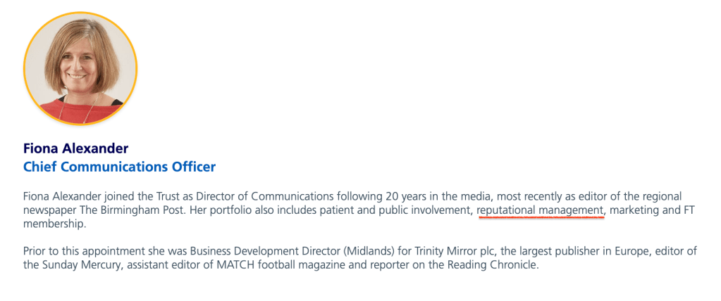 UHB feel no shame it seems in stating that Fiona Alexander’s role is one of reputational management: