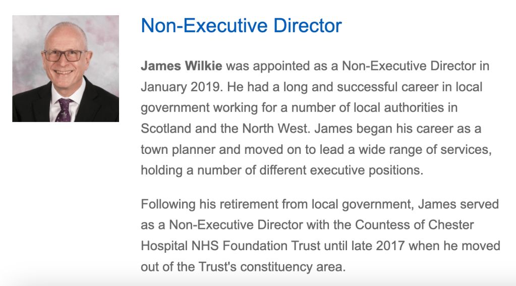 According to trust papers James Wilkie was appointed to the board of the Countess of Chester Hospital NHS Foundation Trust on 1 April 2013 as a trust non executive director.