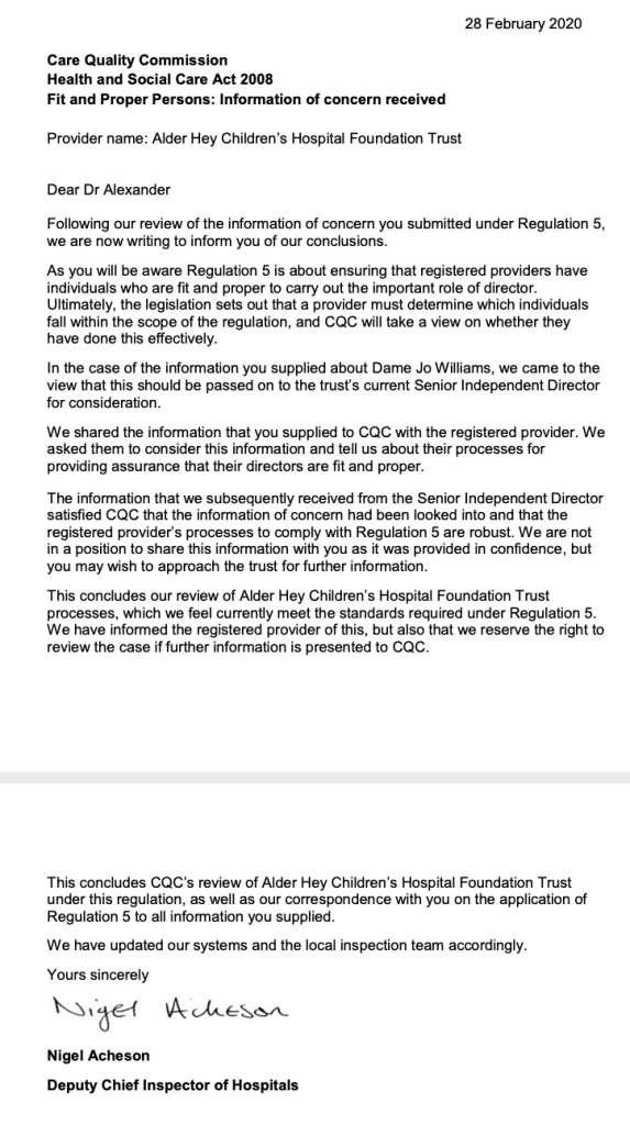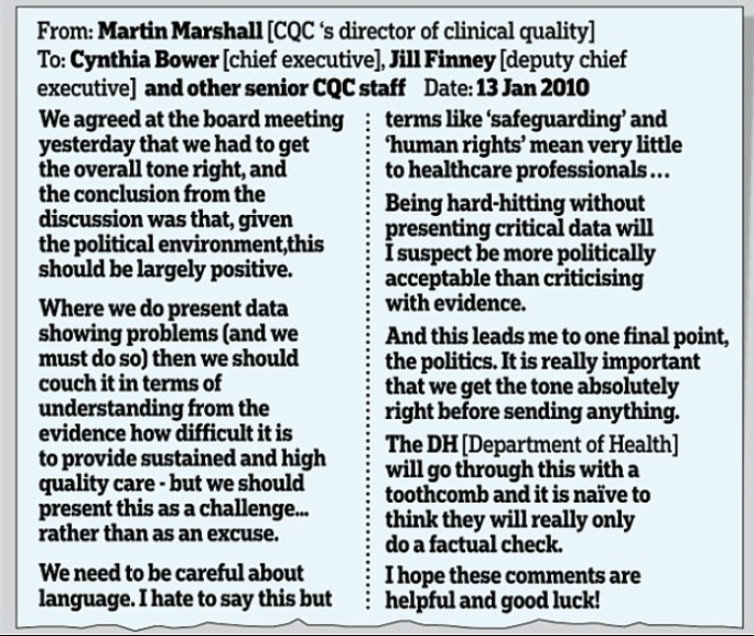 Indeed, CQC and the NHS jointly acted to recycle Jo Williams, the CQC Chair installed by Labour in 2009. This recycling was despite the fact that she had been criticised for harming CQC whistleblowers.