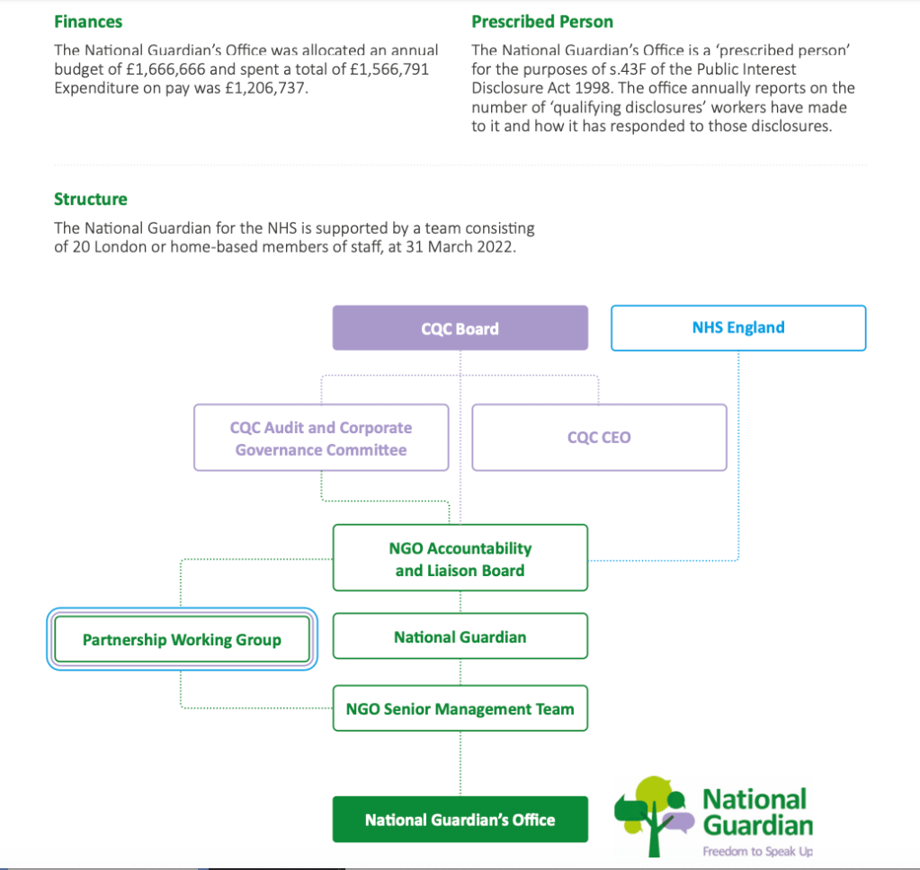 The most recently published National Guardian’s annual report (2021/22) gives a single page at the very end of the most minimal details about the Office’s governance and finance: