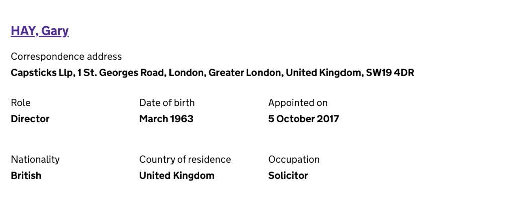 Law2Business Ltd’s sole officer according to Companies House was a Gary Hay, with correspondence address of Capsticks, London.