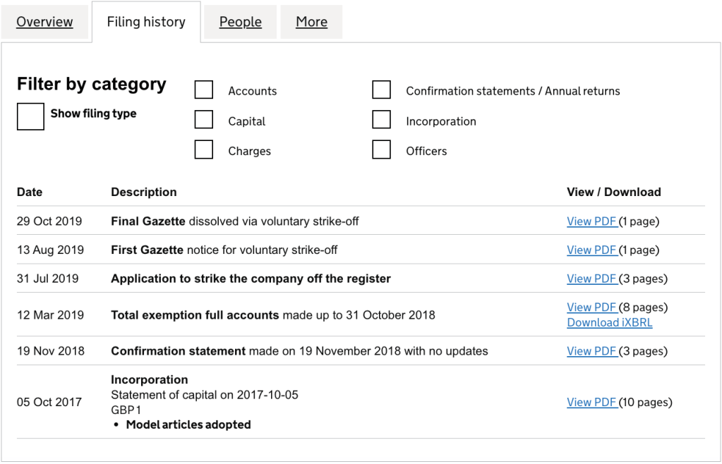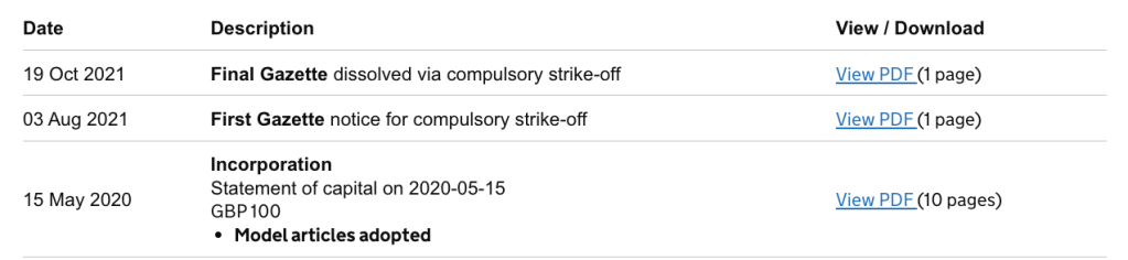 A Companies House entry for Law2Business Ltd indicates that the company was incorporated in October 2017 and dissolved in October 2019.