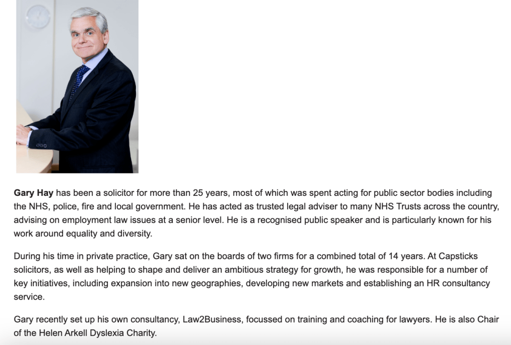 This includes advising NHS trusts with their MHPS cases against doctors (investigations of alleged misconduct and incapability). Gary Hay is listed as one of Capsticks’s key contacts in this document.